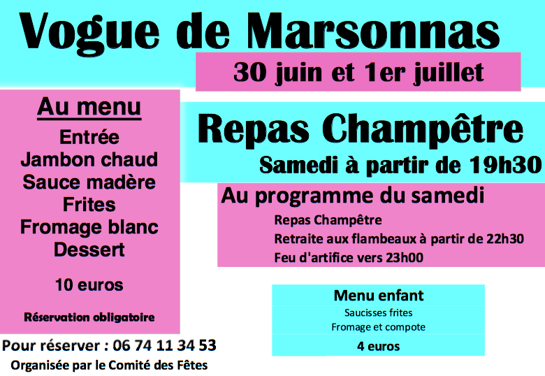 Dès 19h30, le comité des fêtes vous propose un repas à 10 euros : jambon chaud sauce madère, frites, fromage blanc et dessert. Menu enfant à 4 euros. Réservation obligatoire au 06 74 11 34 53 (Comité des Fêtes).