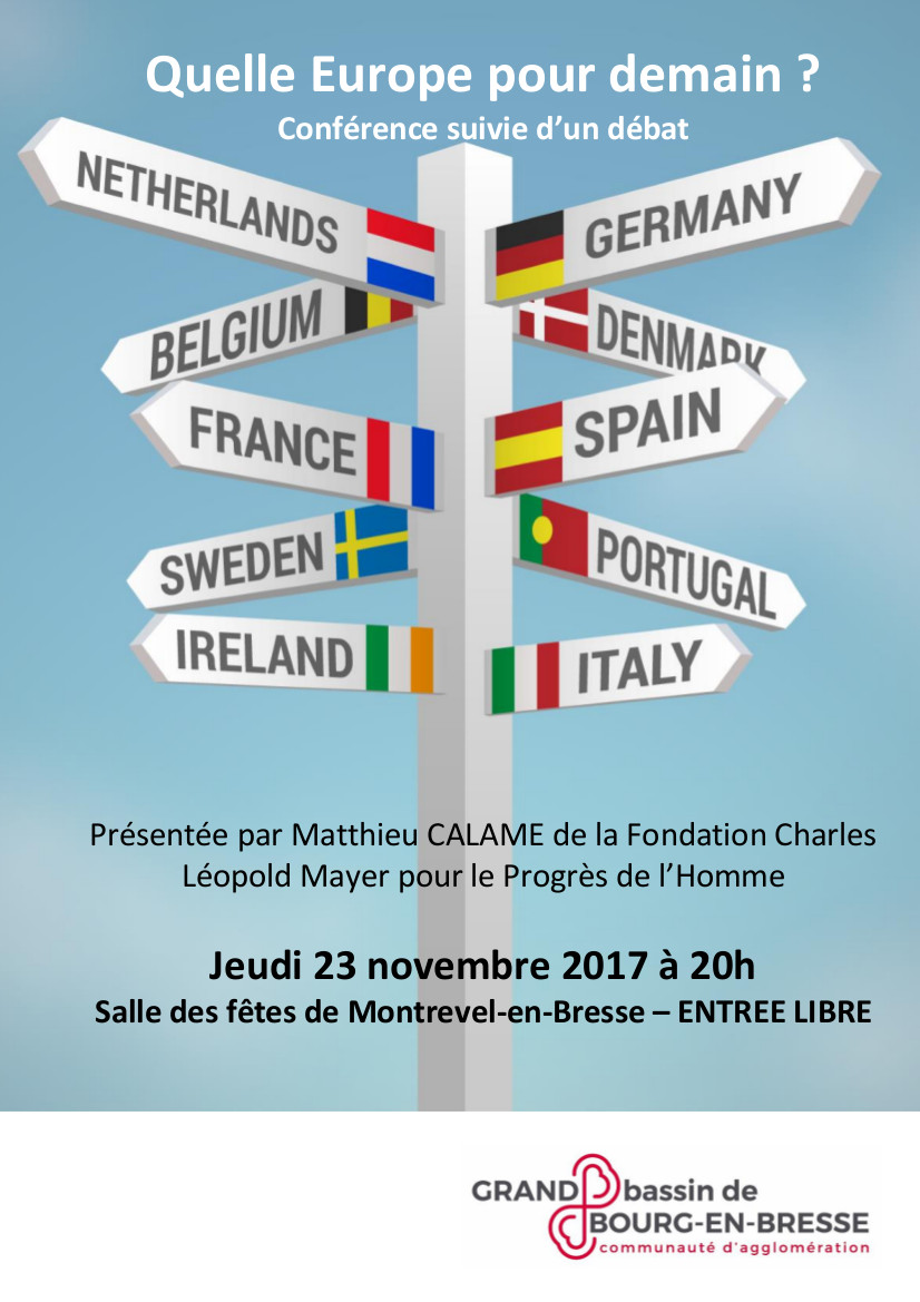 Conférence sur l’Europe à Montrevel le 23 novembre Publié le 21 novembre 2017 par marsonnas Quelle Europe pour demain ? Conférence présentée par Matthieu Calame, jeudi 23 novembre 2017 à 20 heures à la salle des fêtes de Montrevel-en-Bresse. Partager : Partager sur Facebook(ouvre dans une nouvelle fenêtre) Facebook Partager sur X(ouvre dans une nouvelle fenêtre) X Partager sur WhatsApp(ouvre dans une nouvelle fenêtre) WhatsApp Envoyer un lien par e-mail à un ami(ouvre dans une nouvelle fenêtre) E-mail Similaire