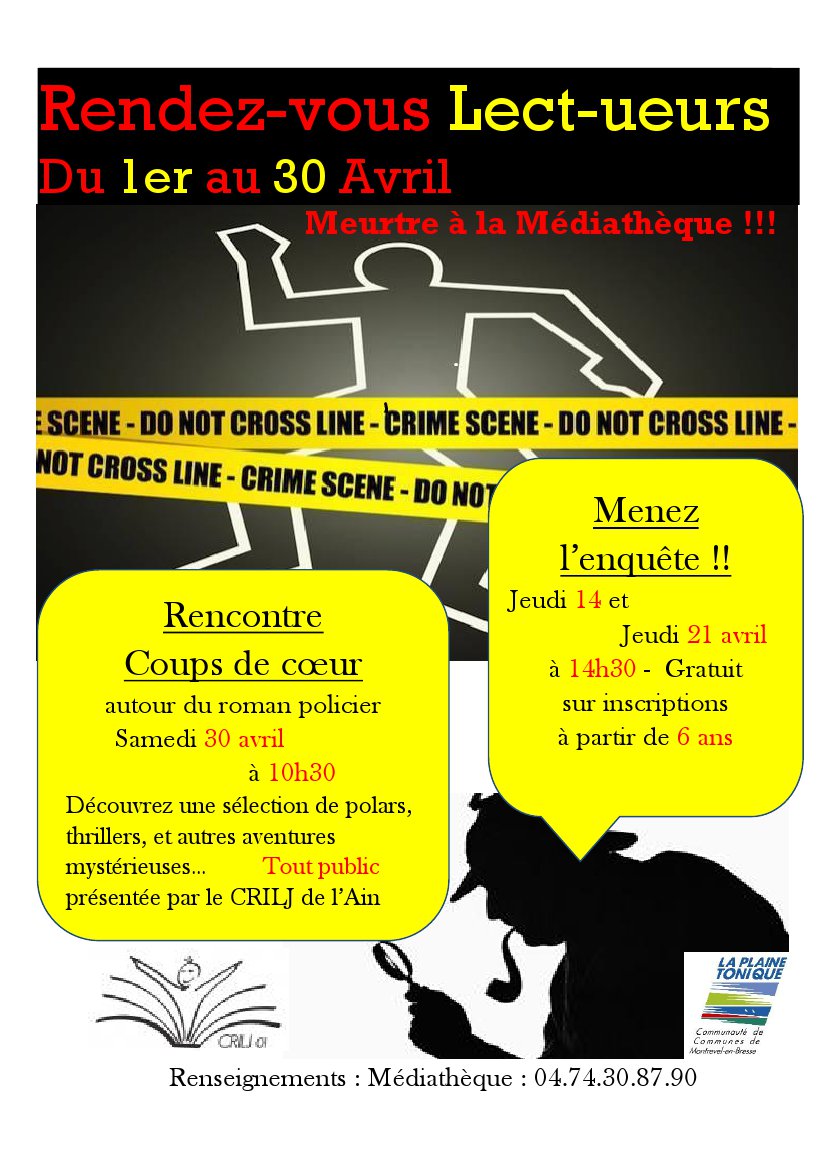 Samedi 30 avril à 10h30, la Médiathèque accueille le Centre de recherche et d’information en littérature de jeunesse de l’Ain (CRILJ) de l’Ain. Il proposera une sélection de livres coups de cœur toujours sur le thème du polar.