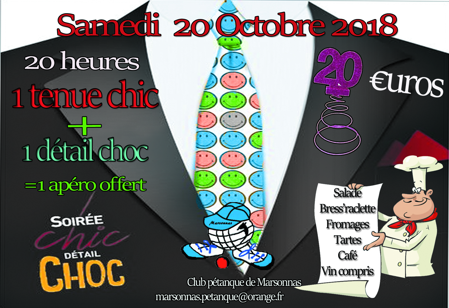 Le club de pétanque de Marsonnas organise sa soirée dansante samedi 20 octobre 2018 à la salle des fêtes de Marsonnas, sur le thème « chic et choc ».