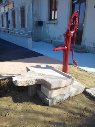 Il faut dire que Jean-Luc Mazier, employé municipal à Marsonnas, n’est jamais à court d’idée quand il s’agit de donner une deuxième vie aux objets délaissés. La pompe du cimetière déplacée, une pierre d’évier récupérée dans l’ancienne cure et le tour est joué. Je vous laisse découvrir cette réalisation venant agrémenter la nouvelle place de l’école.
